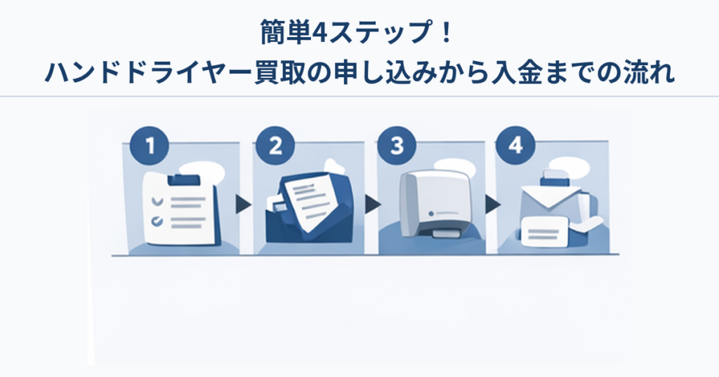 ハンドドライヤーの売却は、意外とシンプルで手間がかかりません。ここでは初めて買取サービスを利用する方でも安心して進められるよう、申し込みから入金までの具体的な流れを4つのステップでご紹介します。