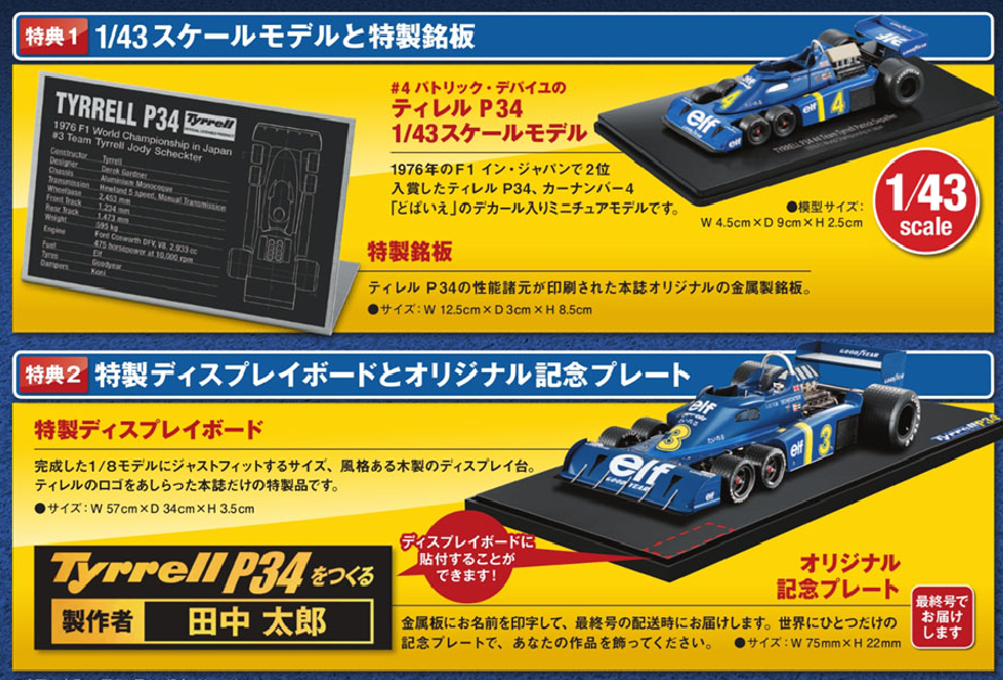 ティレル P34の特典は「ミニカー(ティレルP34 #4 パトリック・デパイユ1/43スケールモデル)」「特製銘板 2点セット」「オリジナルディスプレイボード(W75mm×H22mm)」です。