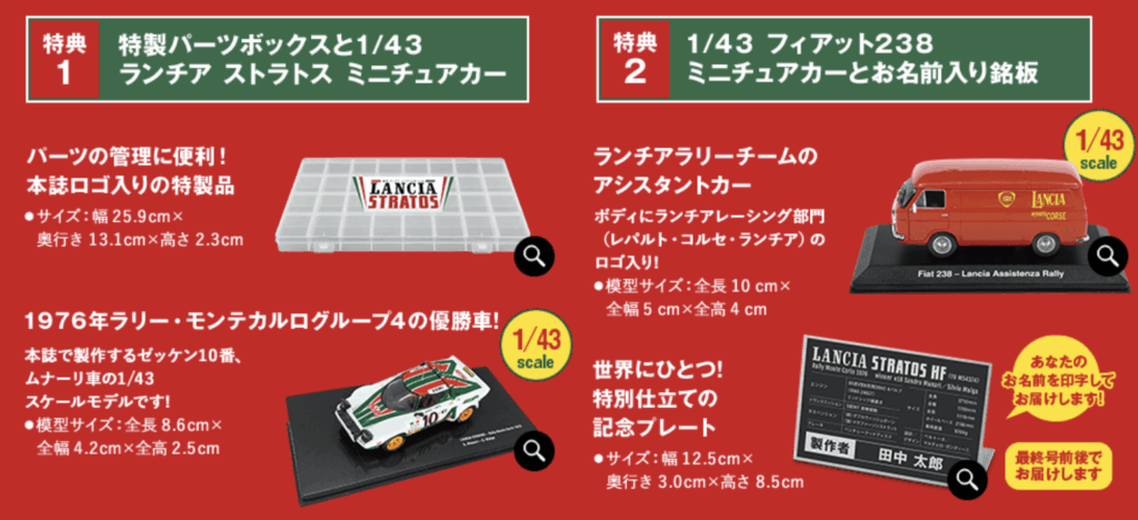 ランチア ストラトスの定期購読者特典は「ロゴ入りパーツボックス」「1976年ラリー・モンテカルログループ4優勝車」「フィアット238ミニカー」「スペックプレート」です。